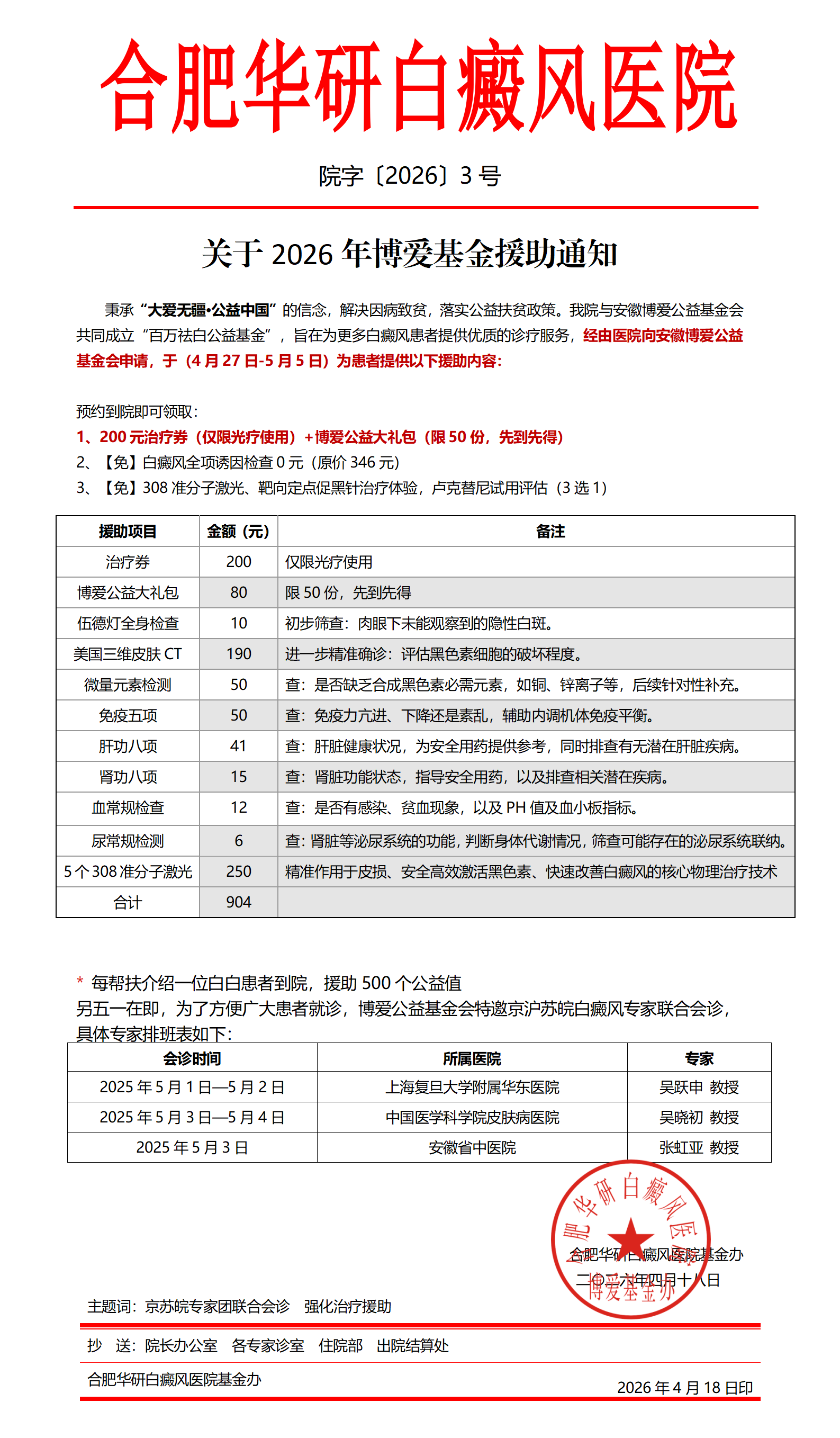 五一将至,白癜风患者福音来啦! 合肥华研白癜风医院联合安徽博爱公益基金会,推出2026年博爱基金援助+京沪苏皖专家联合会诊活动,解决看病贵、看专家难的问题,让你假期里高效祛白!